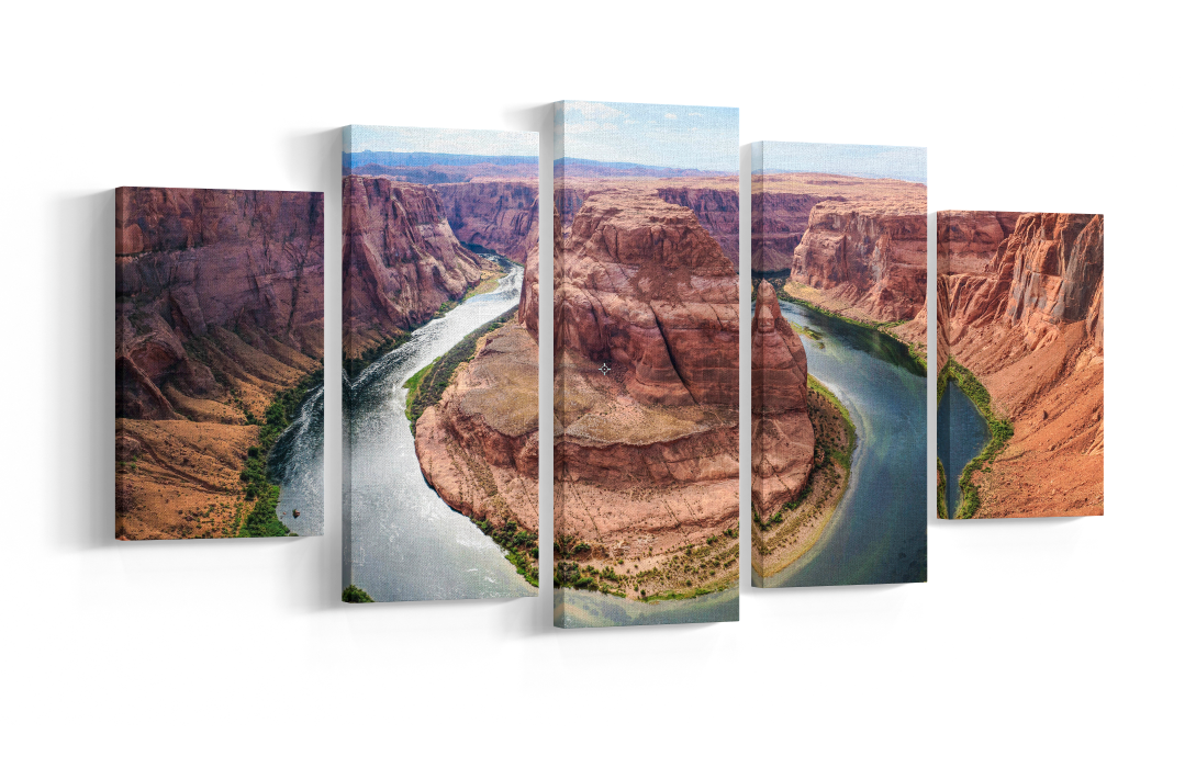 This 5 panel canvas set contains two 12x28's, two 12x20's, and one 12x32 canvas panels for a display size of 32x60 (or a total display size of 32x64 based on 1" spacing). Upload your custom photo using our easy upload button below. After completing your order we will contact you by email and send you a mock up of your image before we print.